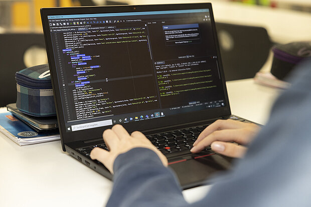 In Klasse 9 liegt der Fokus auf dem Erlernen grundlegender Fähigkeiten in der Programmierung von Software mit der Programmiersprache Python. Die dabei erworbenen Kenntnisse werden in eigenständigen Projekten angewendet, wobei die Schülerinnen und Schüler tiefer in die Struktur von SCRUM eingeführt werden.